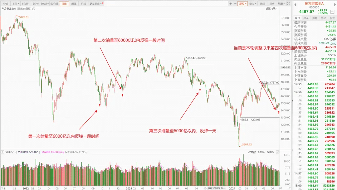 当前是第四次低于 6000 亿成交量级别。若是匹配规律,按理说,短期反弹一下。哪怕是像第三次一样,反弹一天,属于最弱的行情。