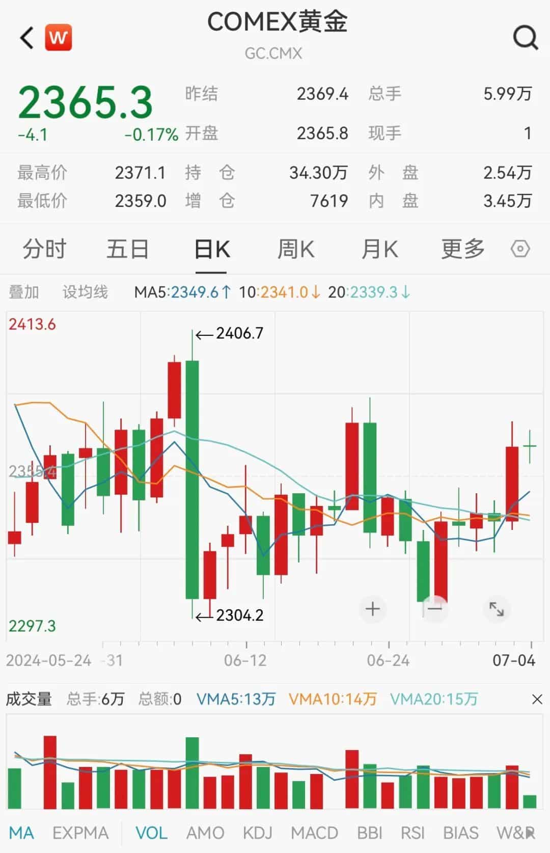 截止收盘,COMEX 黄金收于 2365.3 美元/盎司,微跌 0.17%,上方面临 2380 美元/盎司一线的压制。