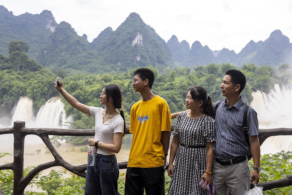 2024 年 7 月 4 日,广西崇左,游客在德天瀑布景区取景拍照。视觉中国 图