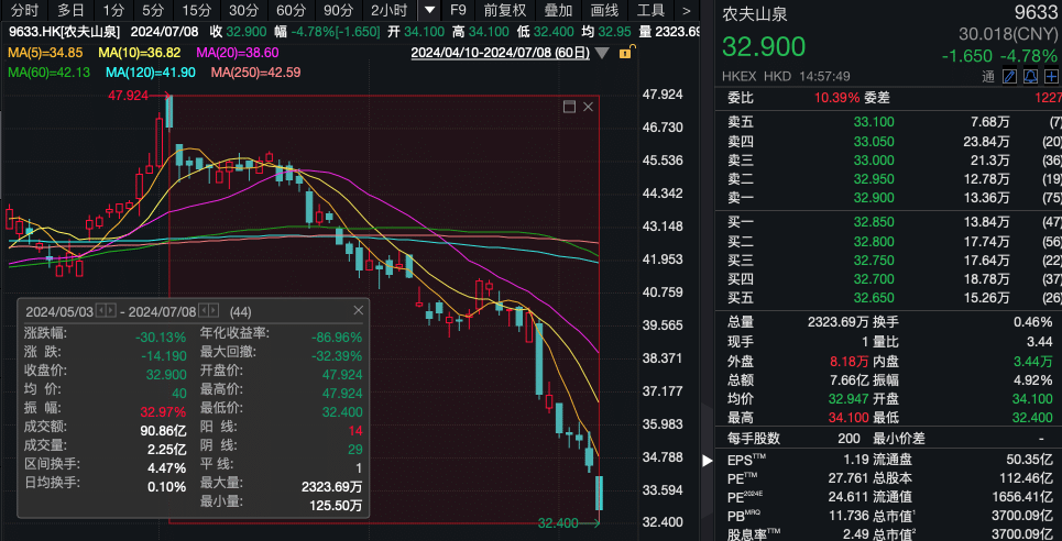 白马股农夫山泉近期走势软弱。7 月 8 日,截至发稿,农夫山泉下跌 5.07%,每股报 32.8 港元,已逼近前期低点。