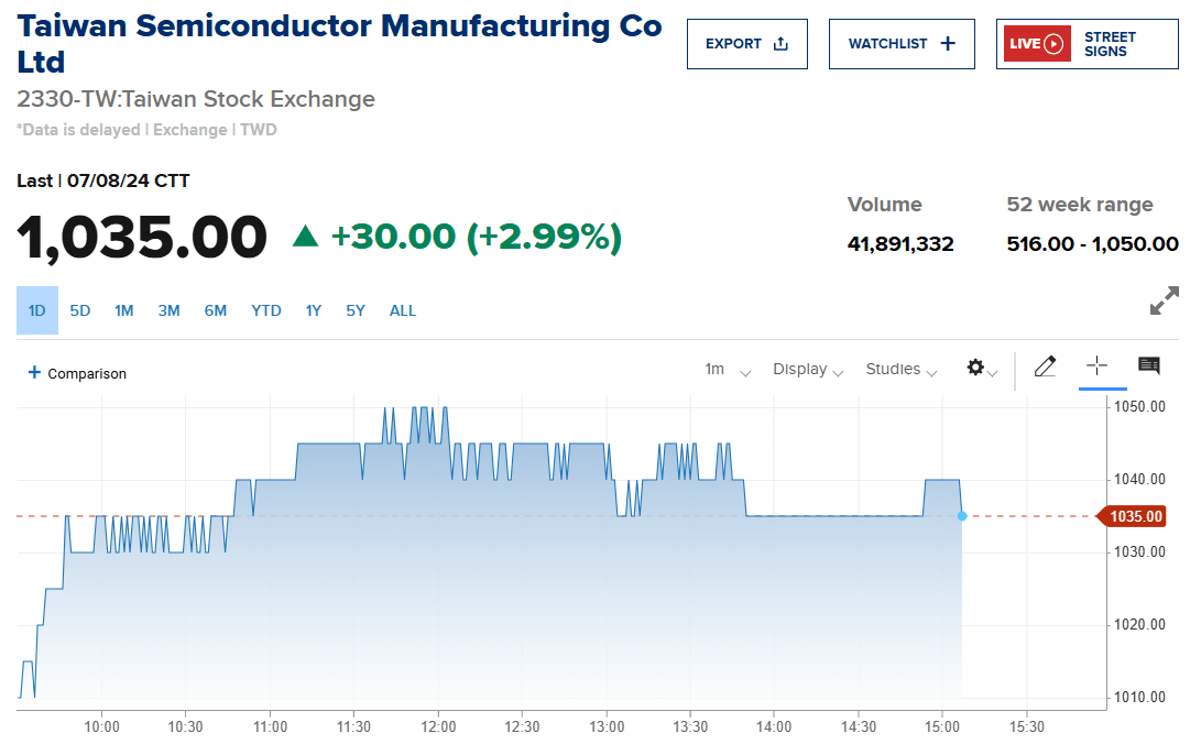 周一,台积电股价在台北一度大涨 4.5%,达到每股 1050 新台币的高位,最终收盘价在 1035 新台币。今年以来,其涨幅已超过 75%。