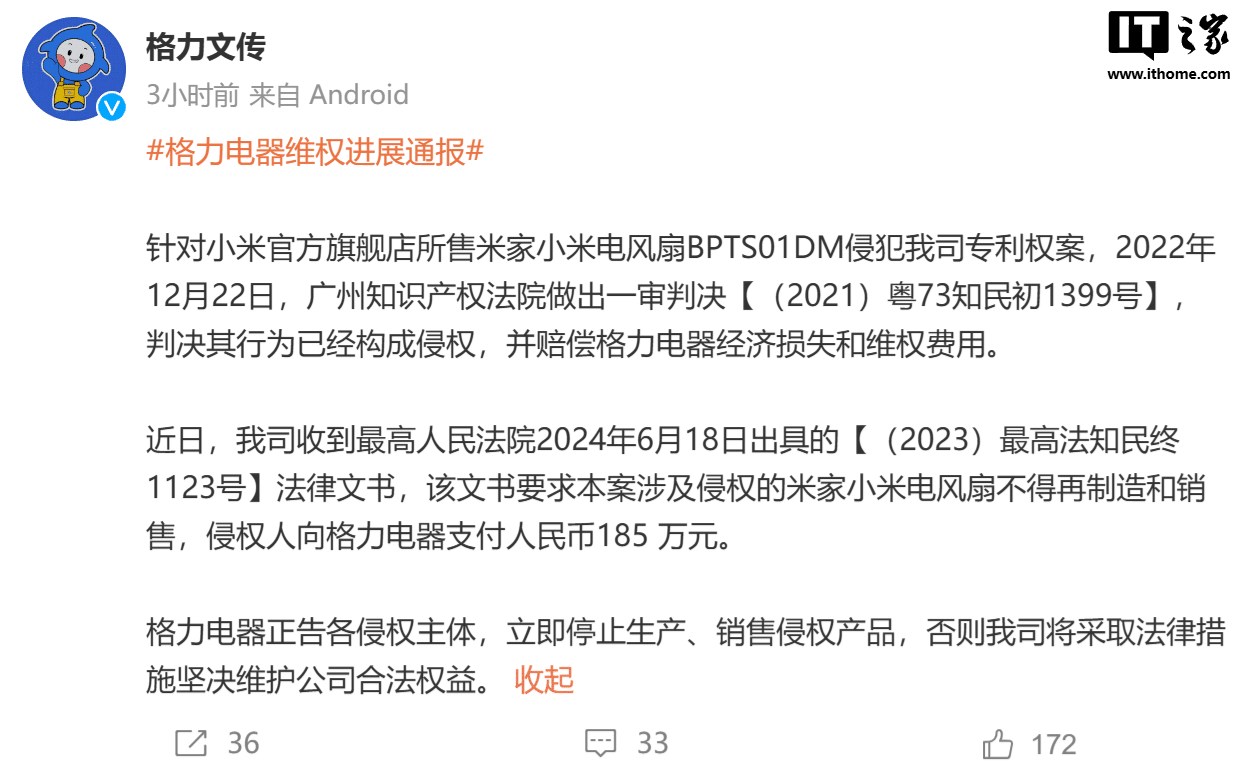 7 月 9 日消息,格力电器官方今日发文,收到最高人民法院 2024 年 6 月 18 日出具的 【(2023) 最高法知民终 1123 号】 法律文书,该文书要求本案涉及侵权的米家小米电风扇不得再制造和销售,侵权人向格力电器支付人民币 185 万元。