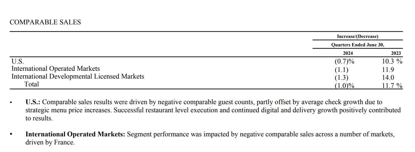 其中,美国门店的可比销售额下降 0.7%,这也是过去 16 个季度中首次出现下降;国际运营市场业务由于法国等 「多个市场」 的走弱下降 1.1%;之前一个财季已经显现出颓势的国际发展许可市场则进一步下降 1.3%,中东战争的影响仍在持续,公司在另外一些市场的经营也缺乏起色。