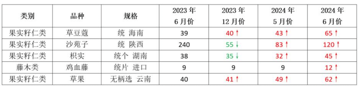 从具体品种来看,草豆蔻,6 月前期商家关注度较高,市场货源走动良好,行情继续上升;沙苑子,随着 6 月寻货商家又有增加,货源走动再次转畅,且行情反弹明显;枳实,虽然新货已经上市,但随着货源不断交易,价格又显上扬;鸡血藤,近日商家购货量增加,市场货源成交量放大,行情稳中趋升;草果,经过前几日下跌后近期关注商家再次增多,主要是受云南产区干旱影响,货源走销顺畅。