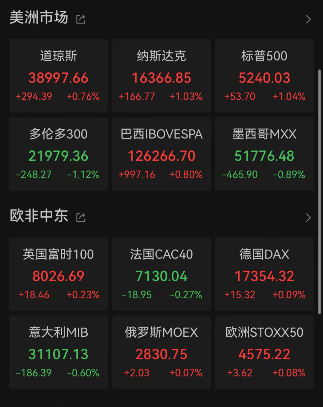美股市场全线反弹,科技股多数上涨,银行股集体上涨。截至收盘,道琼斯工业指数、纳斯达克指数、标普 500 指数分别上涨 0.76%、1.03%、1.04%,盘中纳斯达克指数、标普 500 指数均一度涨逾 2%。