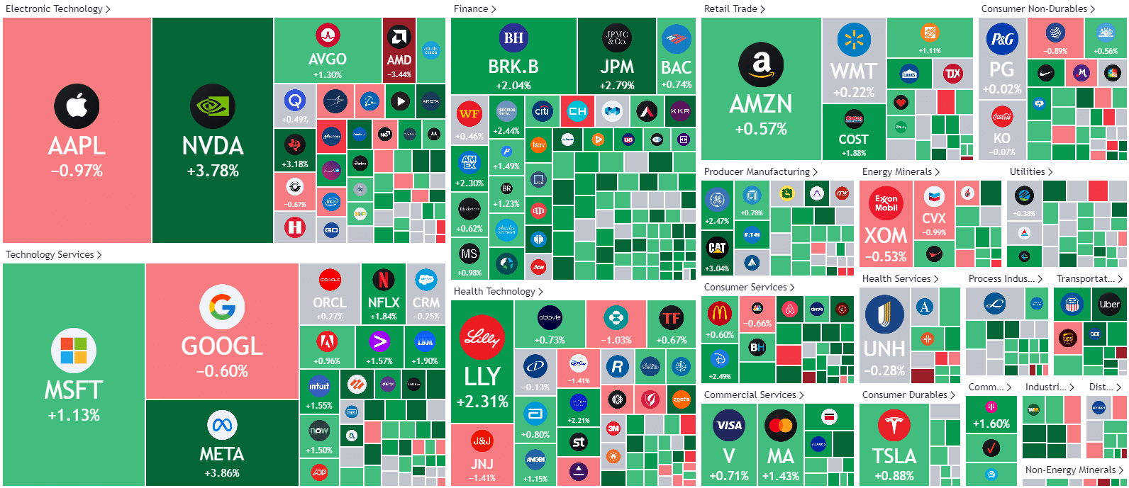 大型科技股涨跌不一,(按市值排列) 苹果跌 0.97%,微软涨 1.13%,英伟达涨 3.78%,谷歌 C 跌 0.06%,亚马逊涨 0.57%,Meta 涨 3.86%,特斯拉涨 0.88%。