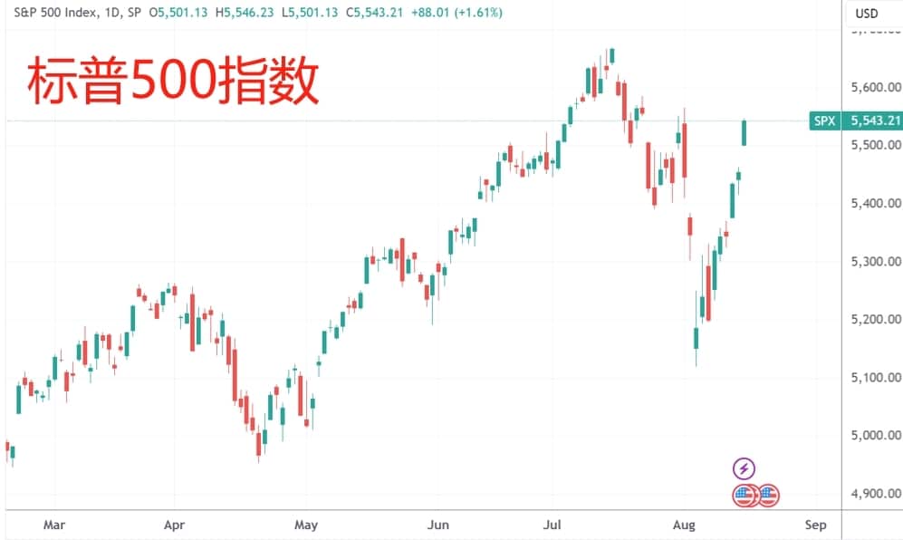 连续第六个交易日上涨后,纳指、标普 500 指数均已收复 8 月 1 日开始的 「连跌惊魂」。从更积极的角度来看,回到 5500 点后,标普 500 指数距离 5669.67 点的历史高位也相差不远了。
