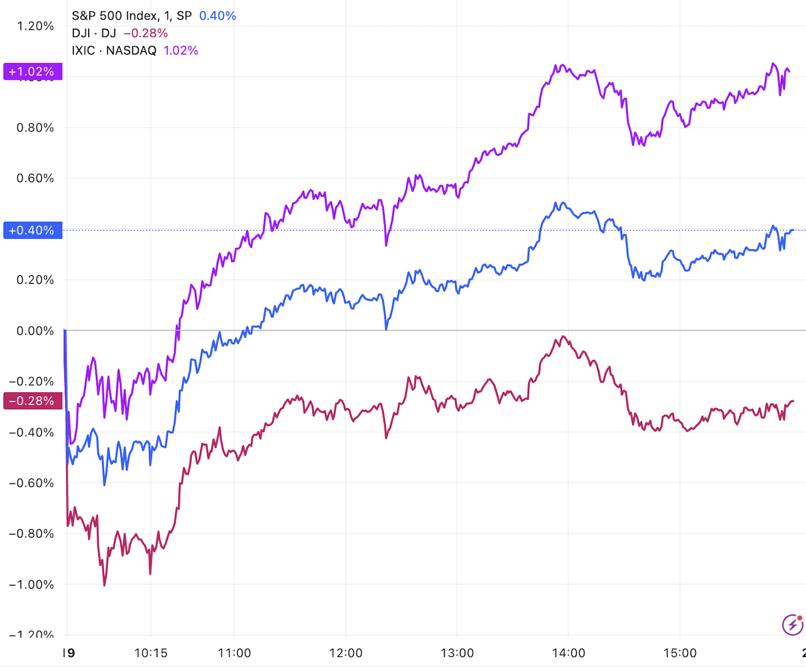 美东时间周二,三大指数低开高走,收盘时仅道指下跌,标普 500 指数小幅上涨,得益于英伟达等科技公司股价上涨,纳指涨 1%。