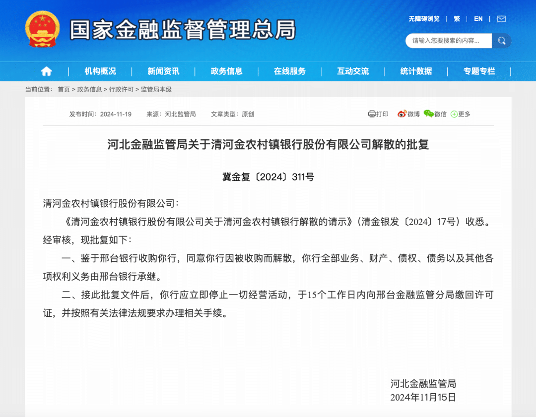 批复文件显示, 鉴于邢台银行收购清河金农村镇银行、沙河襄通村镇银行,河北金融监管局于 11 月 15 日同意这两家村镇银行因被收购而解散。两家银行的全部业务、财产、债权、债务,以及其他各项权利义务由邢台银行承继。