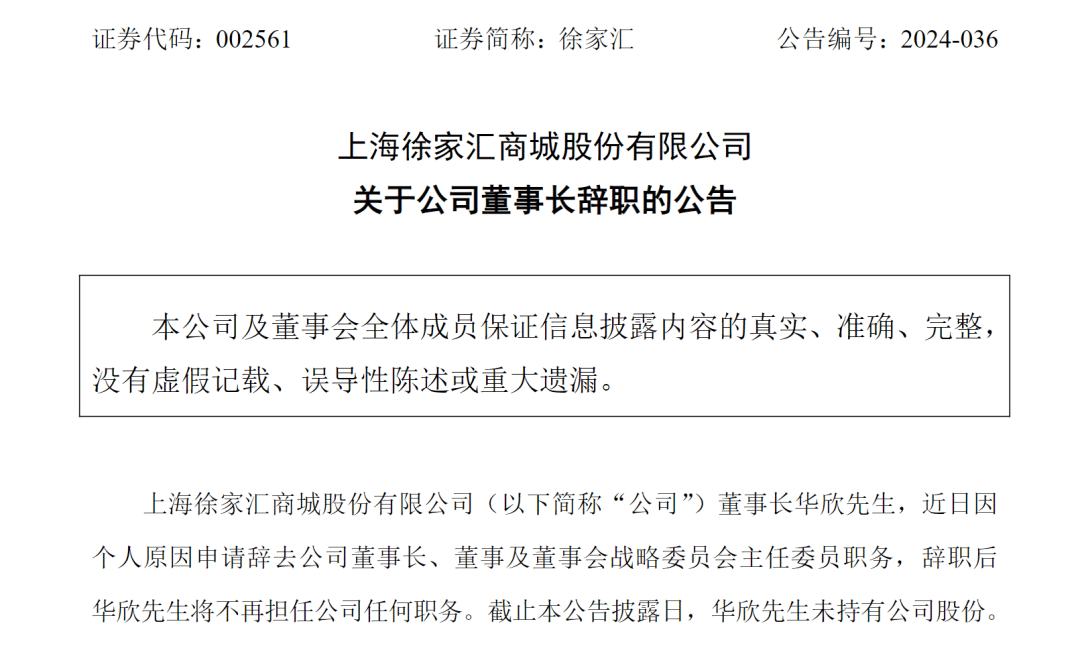 11 月 19 日晚间,上海老牌零售上市公司徐家汇 (002561.SZ) 公告,董事长华欣因个人原因申请辞去公司董事长、董事及董事会战略委员会主任委员职务。辞职后,华欣将不再担任公司任何职务。截至公告披露日,华欣未持有公司股份。