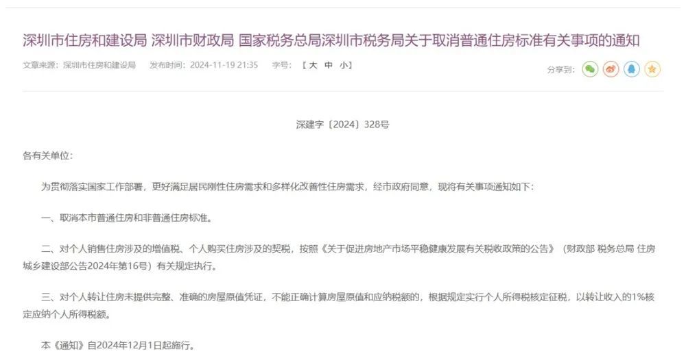 11 月 19 日,深圳市住房和建设局、深圳市财政局、国家税务总局深圳市税务局等三部门联合印发 《关于取消普通住房标准有关事项的通知》,明确自 2024 年 12 月 1 日起取消普通住房和非普通住房标准,并对相关征税问题予以明确。