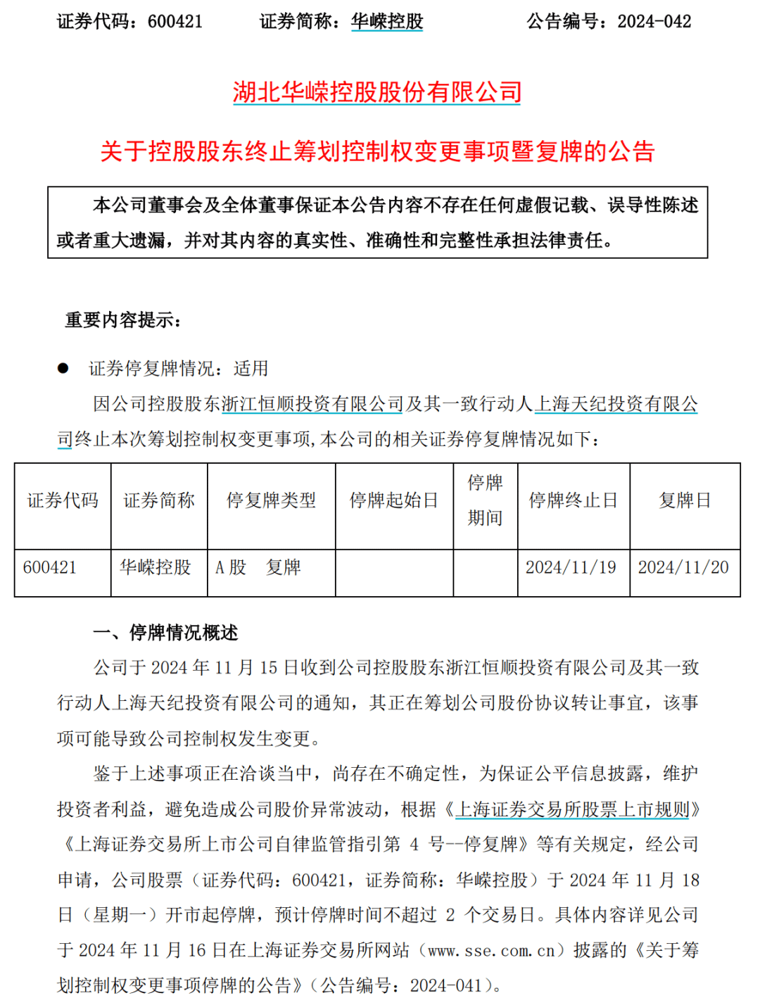 华嵘控股 11 月 19 日晚公告,于 11 月 19 日收到公司控股股东 浙江恒顺投资有限公司及其一致行动人上海天纪投资有限公司 (以下简称上海天纪)的通知,停牌期间,控股股东及其一致行动人与交易对方 未就控股权变更事项达成一致意见。经审慎研究,控股股东及其一致行动人决定终止筹划本次控股权变更事项。