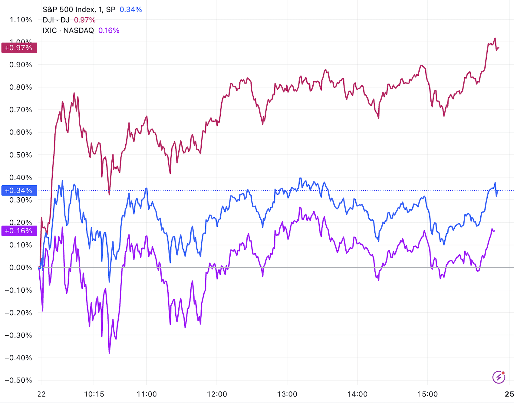 截至收盘,道琼斯指数涨 0.97%,报 44,296.51 点;标普 500 指数涨 0.35%,报 5,969.34 点;纳斯达克指数涨 0.16%,报 19,003.65 点。