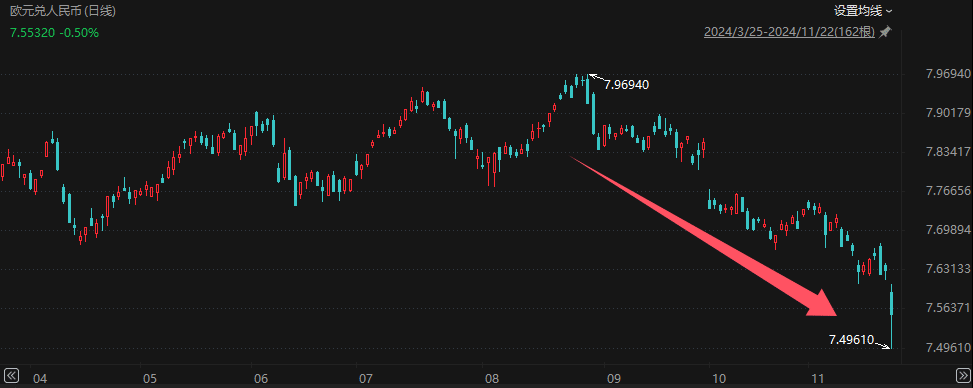 欧元兑人民币的走势变化似乎更为明显——别瞧人民币近来兑美元呈现着弱势,但若把对比目标换成欧元,人民币在过去几周的走势足以堪称强势……