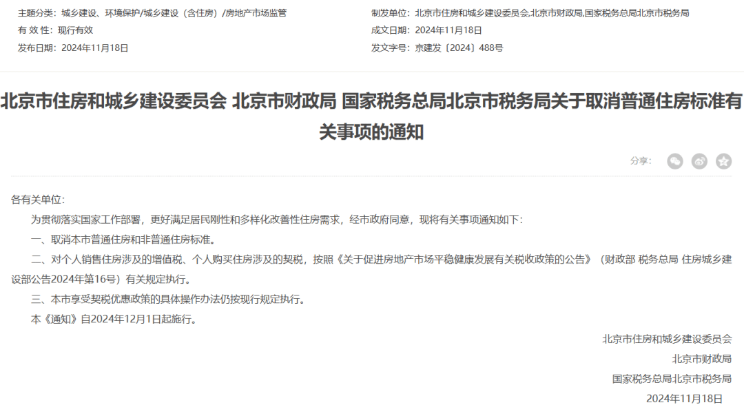 11 月 18 日晚间,北京市住房城乡建设委、北京市财政局、国家税务总局北京市税务局联合印发 《关于取消普通住房标准有关事项的通知》(以下简称 《通知》) 宣布,北京市将取消普通住房和非普通住房标准,自 2024 年 12 月 1 日起施行。