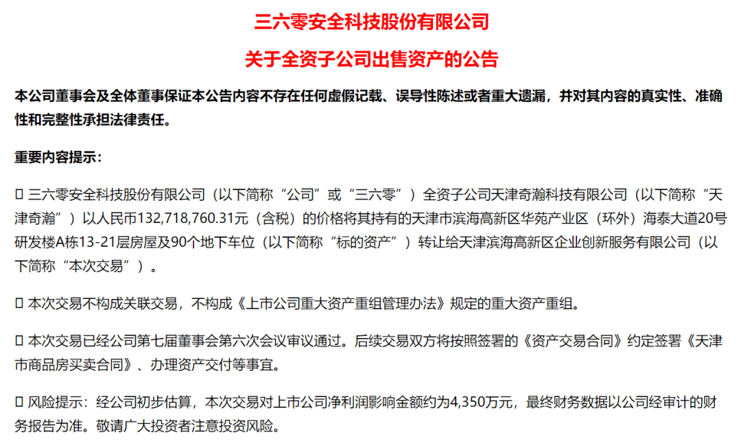 知名企业家周鸿祎旗下的 A 股上市公司三六零,披露全资子公司要以 1.33 亿元出售所持有的位于天津市滨海高新区的房屋和车位。
