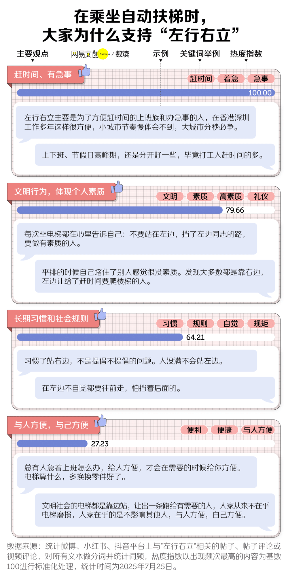 「左行右立」 为赶时间的人提供便利,这让很多人成了它的 「唯粉」。我们统计了社交平台上和 「左行右立」 相关的内容后发现,大家认同这一行为的首要原因就是赶时间。