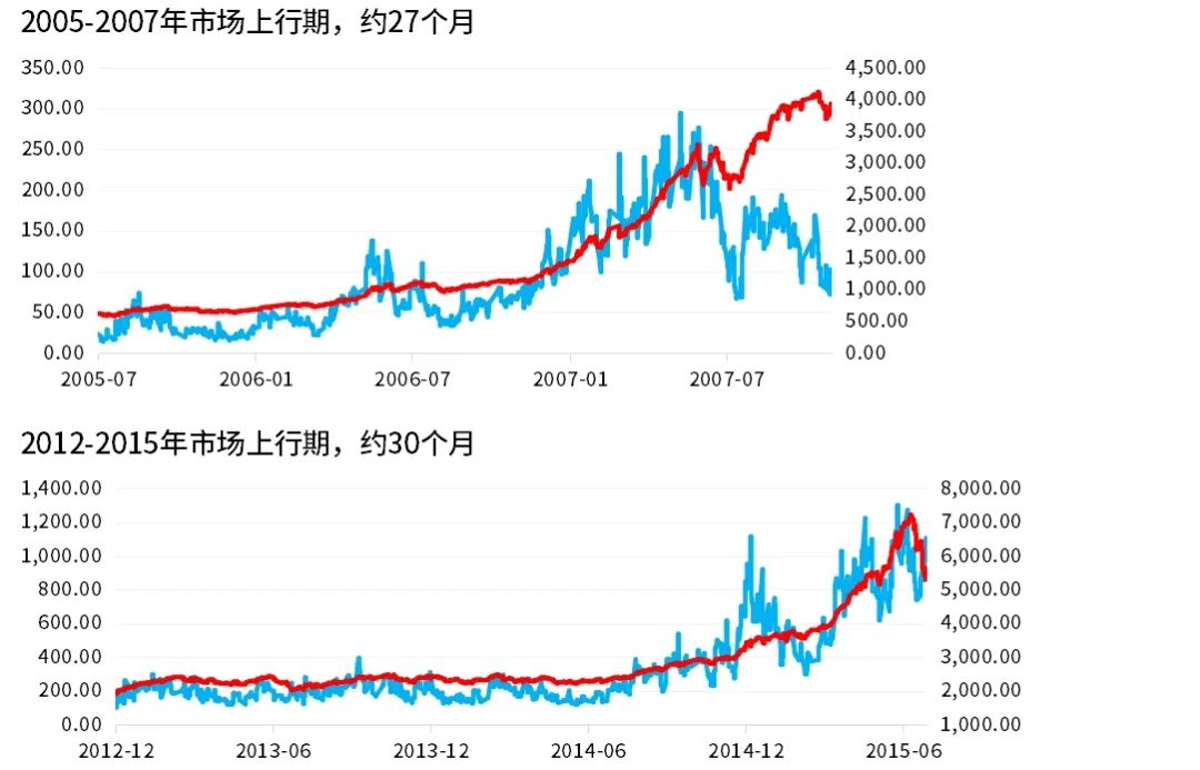 观察时间长度来进行一定的分析,是因为,市场上行期根本上来说是投资者的一致预期向上,这种一致预期的形成,也就是说大家想法的一致化,必然是需要时间的。