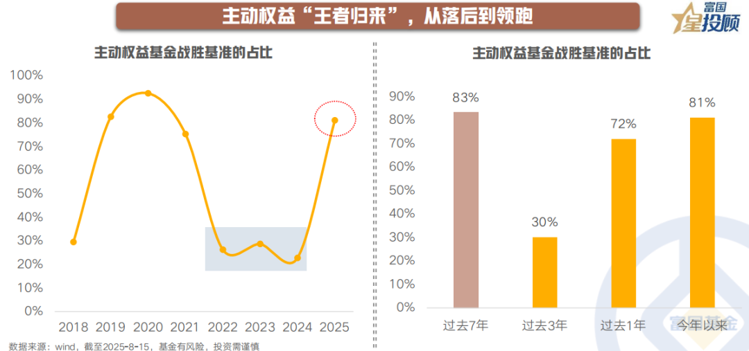 主动权益基金在经历 2022-2024 年的连续三年至暗时刻后,今年以来,终于迎来一场迟到的正名。根据统计,主动权益基金战胜业绩基准的比例已经从不到 30% 飙升至 81%,上演了一场 「惊天大逆转」。