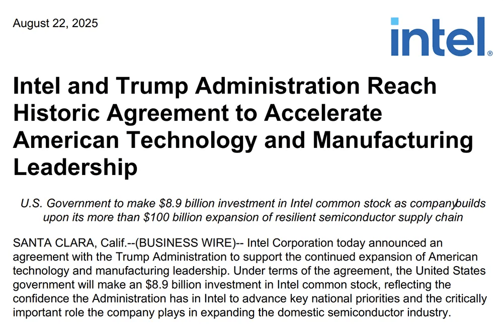 当地时间 8 月 23 日,美国半导体巨头英特尔宣布与美国特朗普政府达成历史性协议,美国政府将向英特尔普通股投资 89 亿美元 (约合人民币 638 亿元),以支持该公司斥资超过 1000 亿美元 (约合人民币 7166 亿元)扩建弹性半导体供应链。