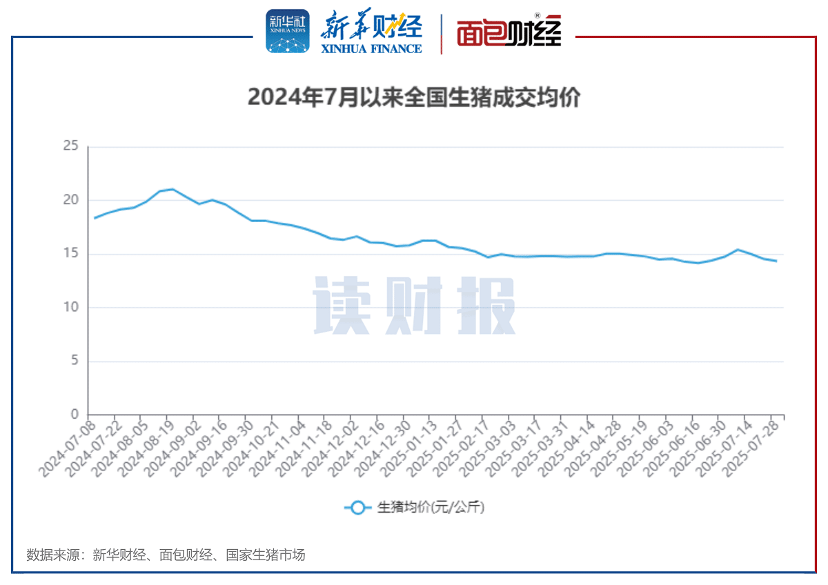 根据国家生猪市场披露的数据,全国生猪成交均价进入 2025 年以来相对稳定,在 15 元/公斤上下浮动。2025 年 7 月,生猪成交均价持续下滑,最低达到 14.33 元/公斤,低于去年同期的 18-19 元/公斤。