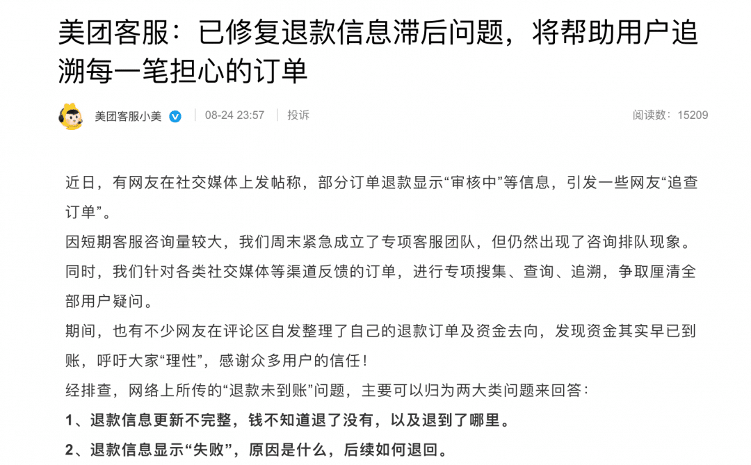 针对有部分用户反映美团 「订单退款未到账」 问题,8 月 24 日深夜,美团客服官方微博发布声明称,因短期客服咨询量较大,已紧急成立专项客服团队,并针对各类社交媒体等渠道反馈的订单,进行专项搜集、查询、追溯。
