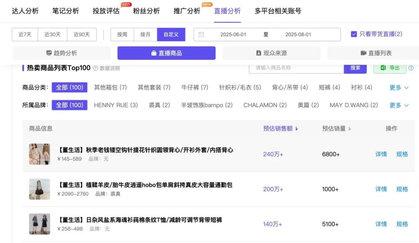 距离 2023 年 1 月份的首场直播已经过去 33 个月了,董洁也进行了 33 场直播,偶尔会停播, 购物节前后也会加播,但总体还是以平均一个月一场的节奏稳定输出着。