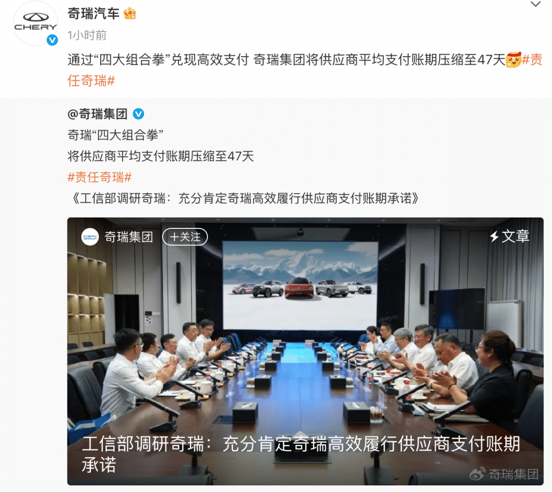 奇瑞集团表示,通过实施 「四大组合拳」,奇瑞集团将供应商平均支付账期压缩至 47 天,切实缓解了供应商资金压力,促进供应链体系持续健康发展。(御风)