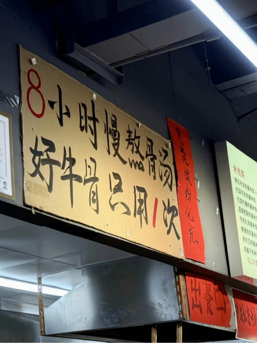 这些米线小店,多数主打「废墟风」 装修,墙面要么糊水泥,要么露红砖。「漂泊十三年,终于有了这家米线店」「什么爱您无限,不如我的牛肉米线」的标语,直接拿纸板手写往墙上一挂,倒成了年轻人打卡拍照的背景板。