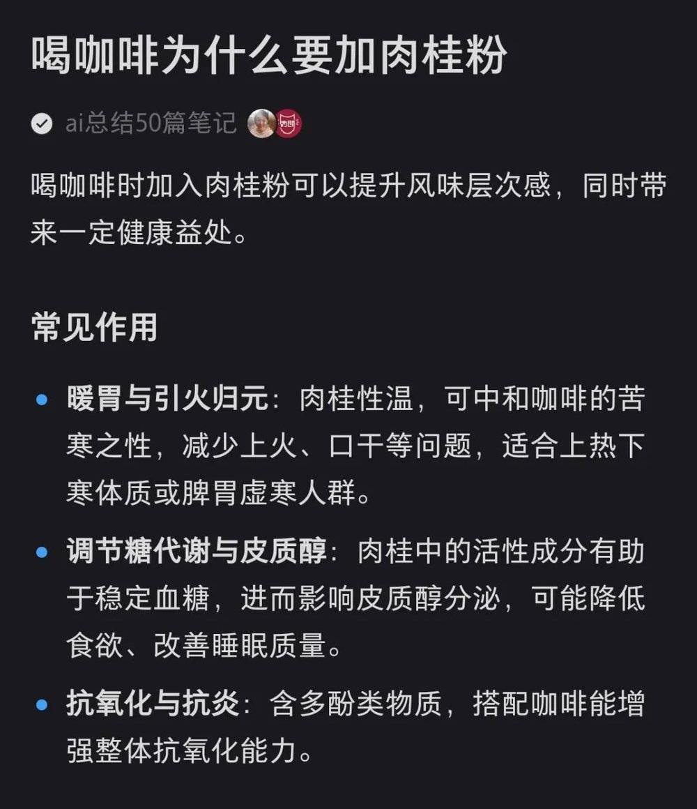 刷小红书时,有一个话题:喝美式太多,容易得胰腺癌,所以老外喝咖啡会加肉桂粉。