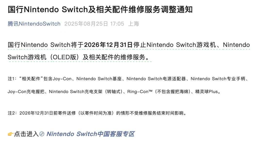 【旭才科技】8 月 26 日消息,据腾讯 Nintendo Switch 官方公众号消息,国行 Nintendo Switch 将于 2026 年 12 月 31 日停止 Nintendo Switch 游戏机、Nintendo Switch 游戏机 (OLED 版) 及相关配件的维修服务。