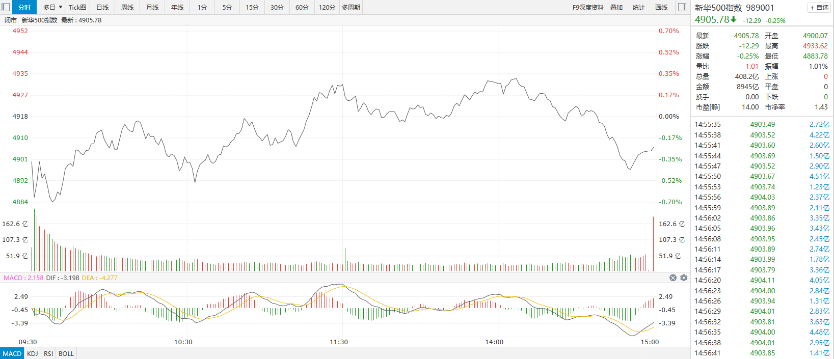 指数盘中最高触及 4933.62 点,最低触及 4883.78 点,成分股全天总成交额报 8945 亿元,总成交额较上一交易日显著缩量。