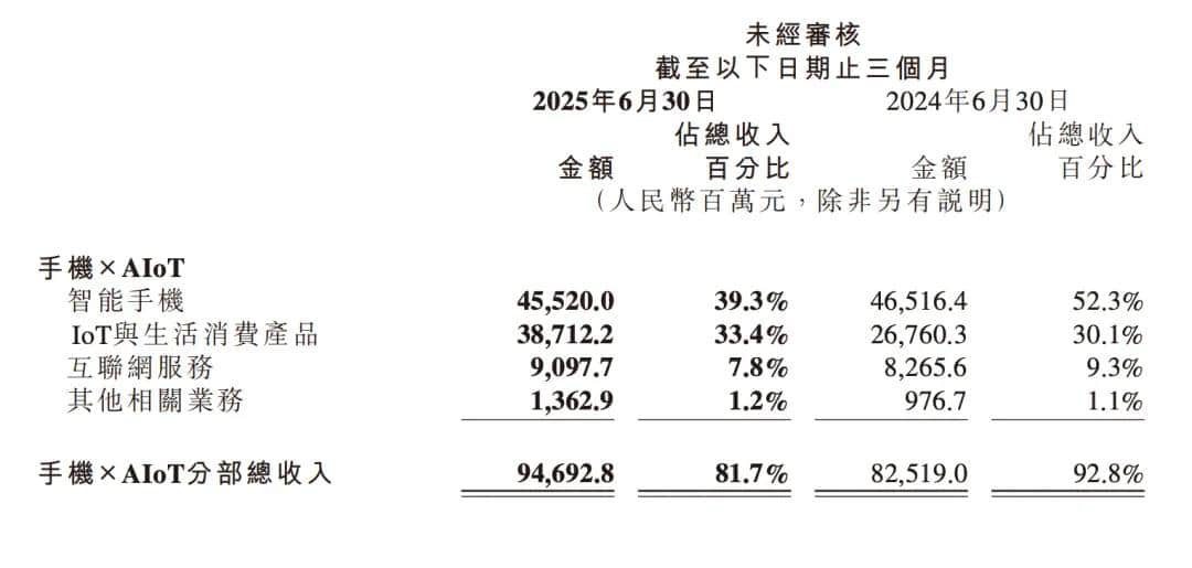 财报显示,2025 年第二季度,IoT 板块总营收达到 387 亿,同比增长 44.7%,占本季度集团总营收的 33.4%。值得一提的是,该板块整体营收规模和 「智能手机」 板块之间的差值,从上一季度的 183 亿元,迅速缩小至 68 亿元。