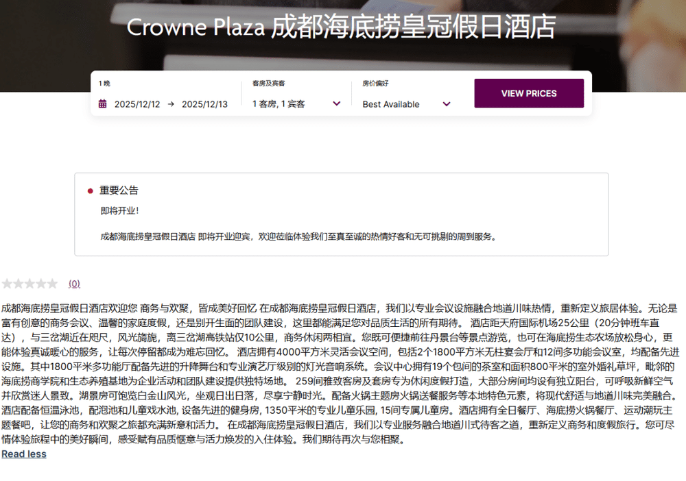最近,我注意到 IHG(洲际酒店集团)官网发布了一家即将开业的新酒店——成都海底捞皇冠假日酒店。
