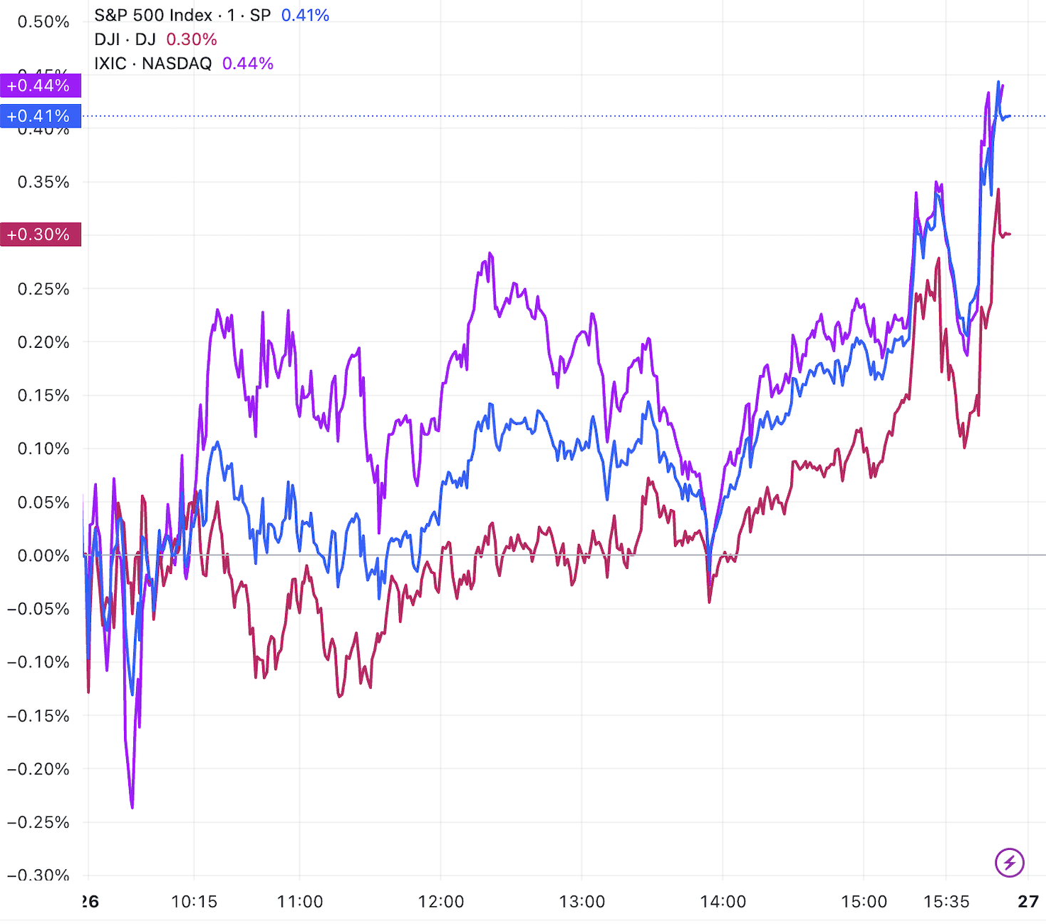 截至收盘,道琼斯指数涨 0.30%,报 45,418.07 点;标普 500 指数涨 0.41%,报 6,465.94 点;纳斯达克指数涨 0.44%,报 21,544.27 点。