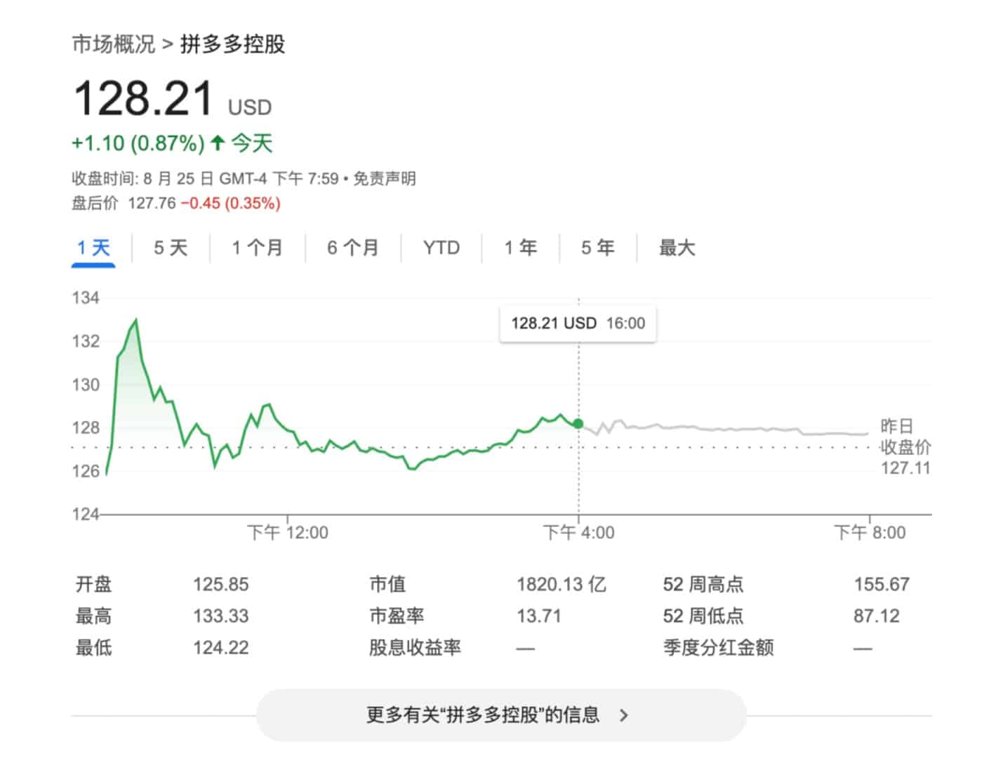 电话会结束,拼多多美股股价涨幅不再,一路从大涨 10% 缩减至持平。昨日美股收盘,拼多多股价 128.21 美元,涨幅仅 0.87%。