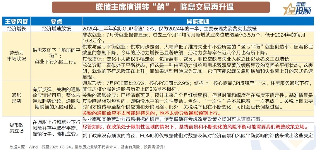 鲍威尔在 8 月 22 日的杰克逊霍尔央行年会上发言转鸽,认为就业下行风险大于通胀上行风险,甚至强调就业下行风险带来的严重后果是 「大幅增加裁员和失业率上升」,风险平衡的转变要求 「调整」 政策立场,或为新一轮预防式降息启动提供前瞻指引,具体来看: