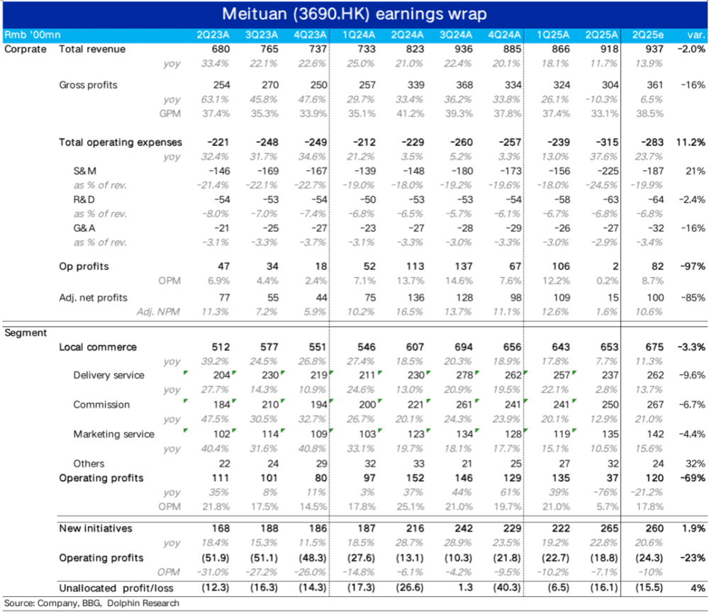 3. 2Q 已然如此,3Q 会多恐怖?核心本地商业板块本季的经营利润仅为 37 亿,虽然有调研表示美团在 5、6 月份时即时零售业务的利润可能已经很低,彭博一致预期参考价值不大。