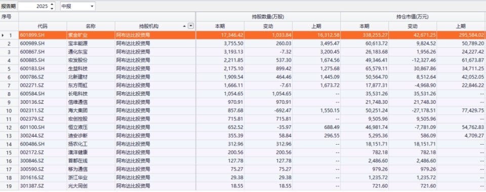 其中,阿布达比投资局对紫金矿业宝丰能源通化东宝宏发股份生益科技等 8 只股票的持股数量均超过 1000 万股。今年二季度,阿布达比投资局新进了长电科技信维通信宏创控股扬农化工等 9 只股票前十大流通股股东名单。