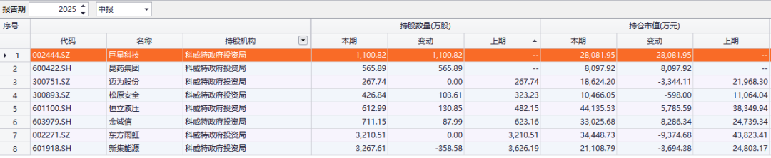 科威特政府投资局持有 8 只 A 股,持股数量为 1 亿股,持股市值为 19.8 亿元。其中,科威特政府投资局持有新集能源东方雨虹巨星科技的数量分别为 3267.61 万股、3210.51 万股、1100.82 万股。今年二季度,科威特政府投资局新进了巨星科技昆药集团前十大流通股股东名单。