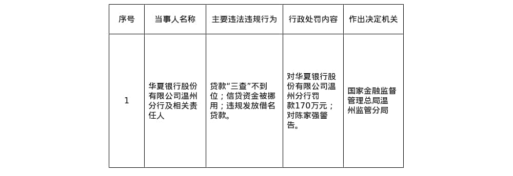 罚单显示,华夏银行股份有限公司温州分行的主要违法违规事实 (案由) 为:贷款 「三查」 不到位;信贷资金被挪用;违规发放借名贷款。