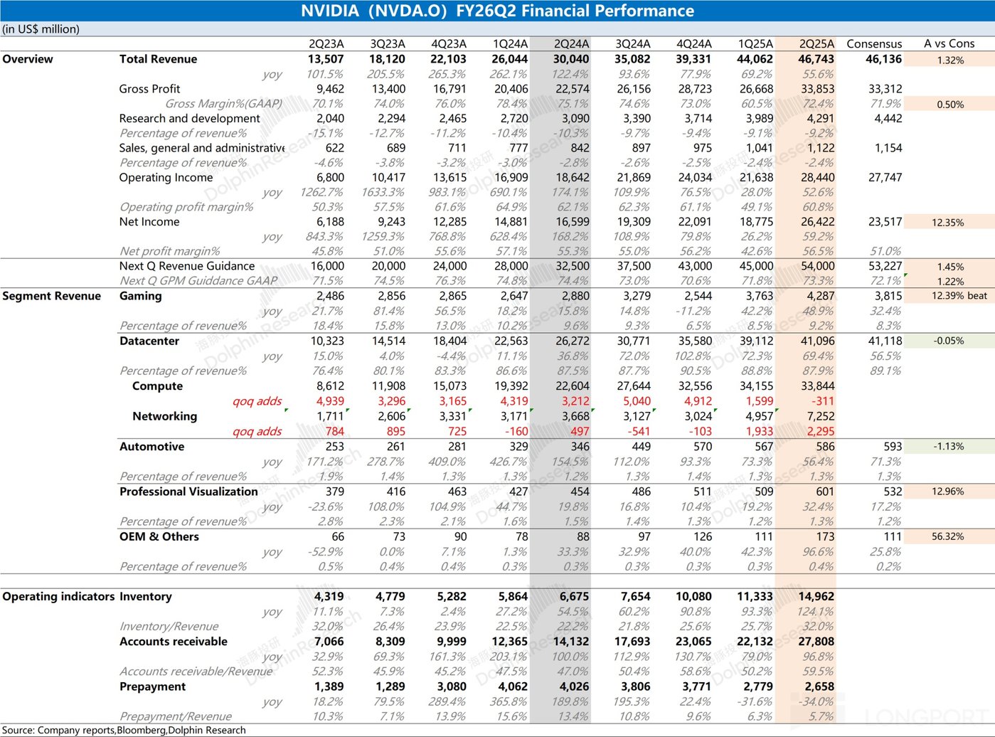 4. 利润:公司本季度核心经营利润 284 亿美元,同比增长 52.6%,其中核心经营利润率回升至 60.8%。公司上季度核心经营利润的下滑,主要受 H20 存货减值相关费用的 45 亿美元的影响。当前在 GB 系列产品量产增加的带动下,公司核心经营利润将在下半年延续增长的表现。