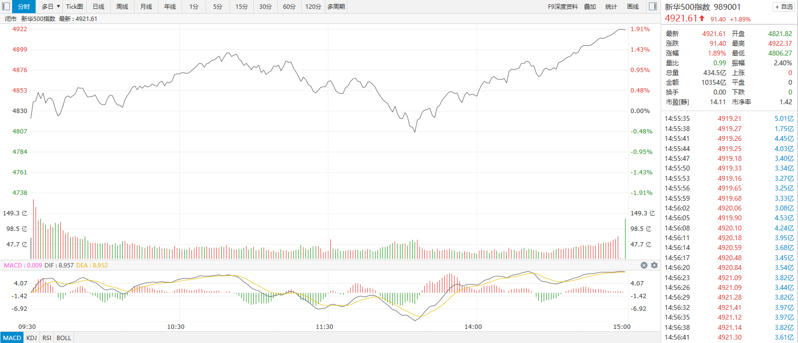 指数盘中最高触及 4922.37 点,最低触及 4806.27 点,成分股全天总成交额报 10354 亿元,总成交额较上一交易日小幅缩量。