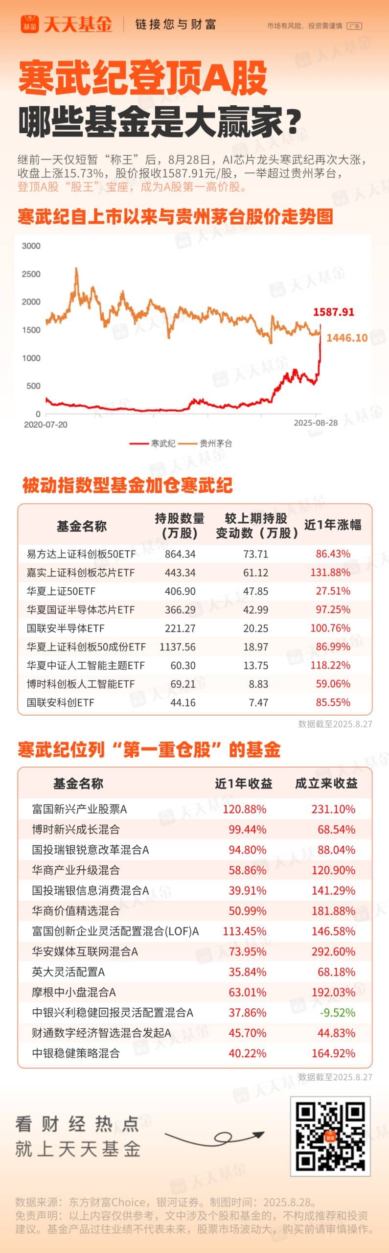 寒武纪在二级市场的表现给予了相关基金丰厚的净值回报,截至 8 月 27 日,多只产品近一年来回报率已翻倍。