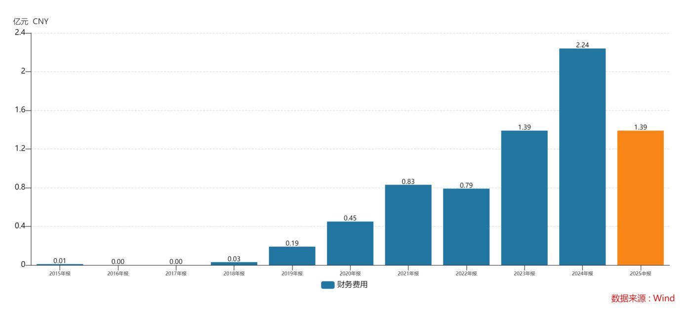 值得注意的是,奥飞数据上半年发生财务费用约 1.39 亿元,较 2024 年同期的 1.11 亿元增长 25.92%,已达到 2023 年全年财务费用水平;其中利息支出 1.39 亿元,超过当期净利润 0.88 亿元。