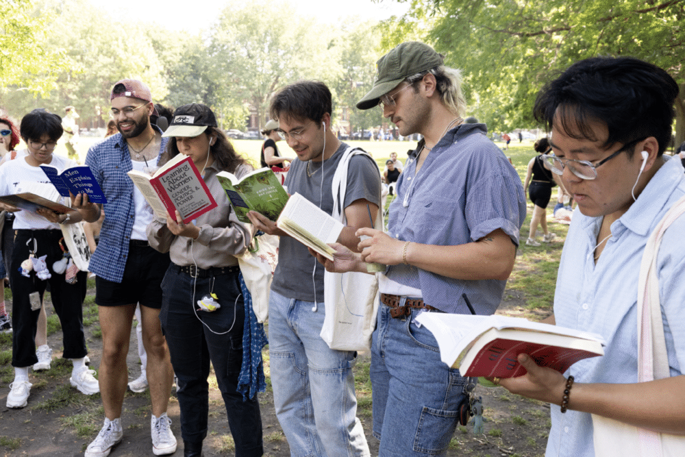 8 月 9 日在芝加哥举行的 performative male 比赛。参赛者在排队报名比赛时,阅读 《傲慢与偏见》 等书籍。大赛获胜者获得了 Homebody Matcha 的优惠券|图源:Block Club Chicago