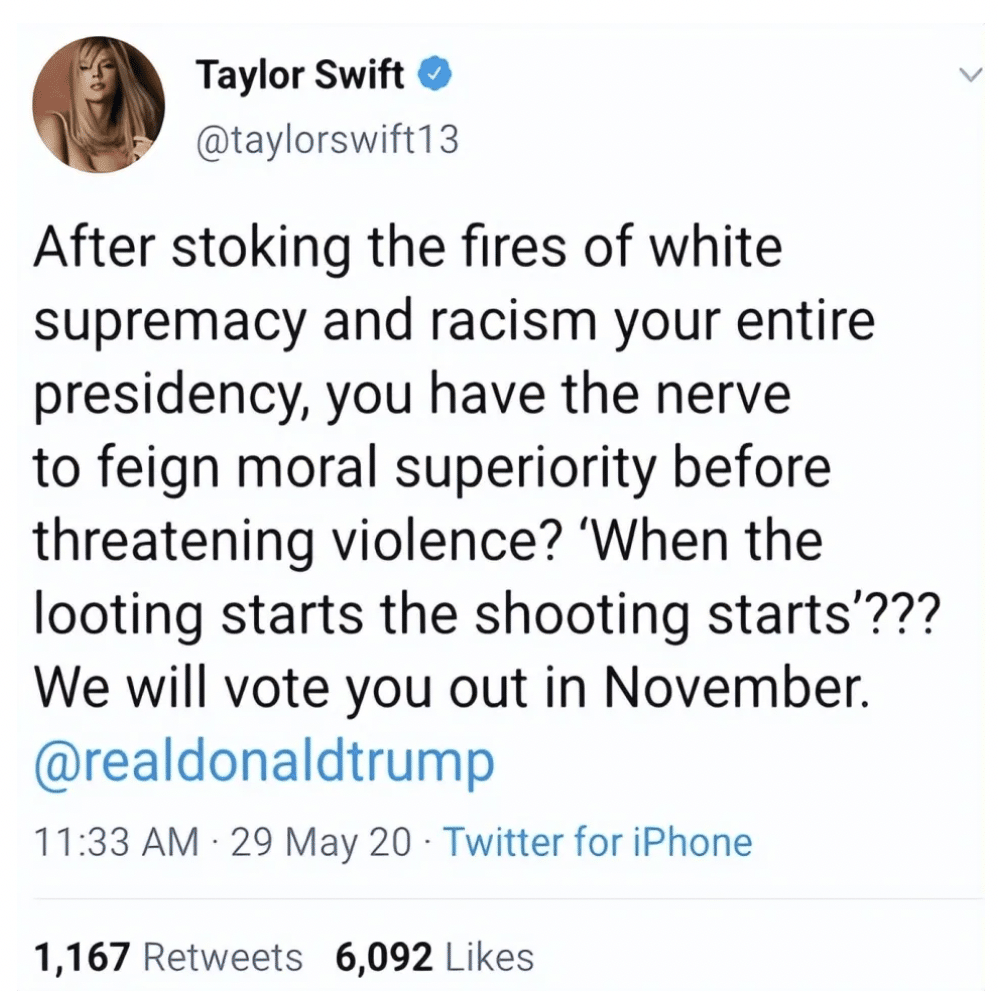 2020 年 5 月 29 日,泰勒·斯威夫特在推特上公开批评特朗普。(图/社交媒体截图)