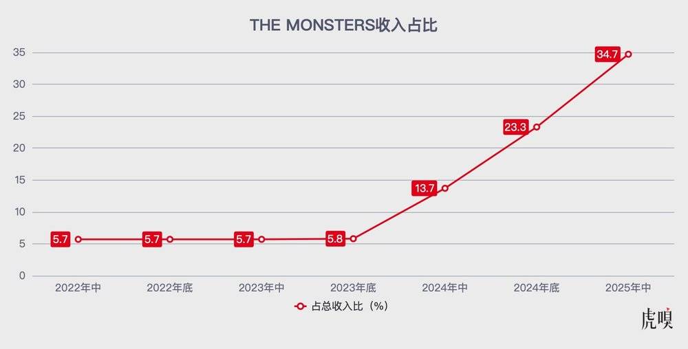 2025 年上半年,包括 LABUBU 在内的 THE MONSTERS 实现营收 48.1 亿元,同比增长 668.0%,是泡泡玛特旗下增速最快的 IP。而在占比上,THE MONSTERS 贡献了公司上半年收入的 34.7%。
