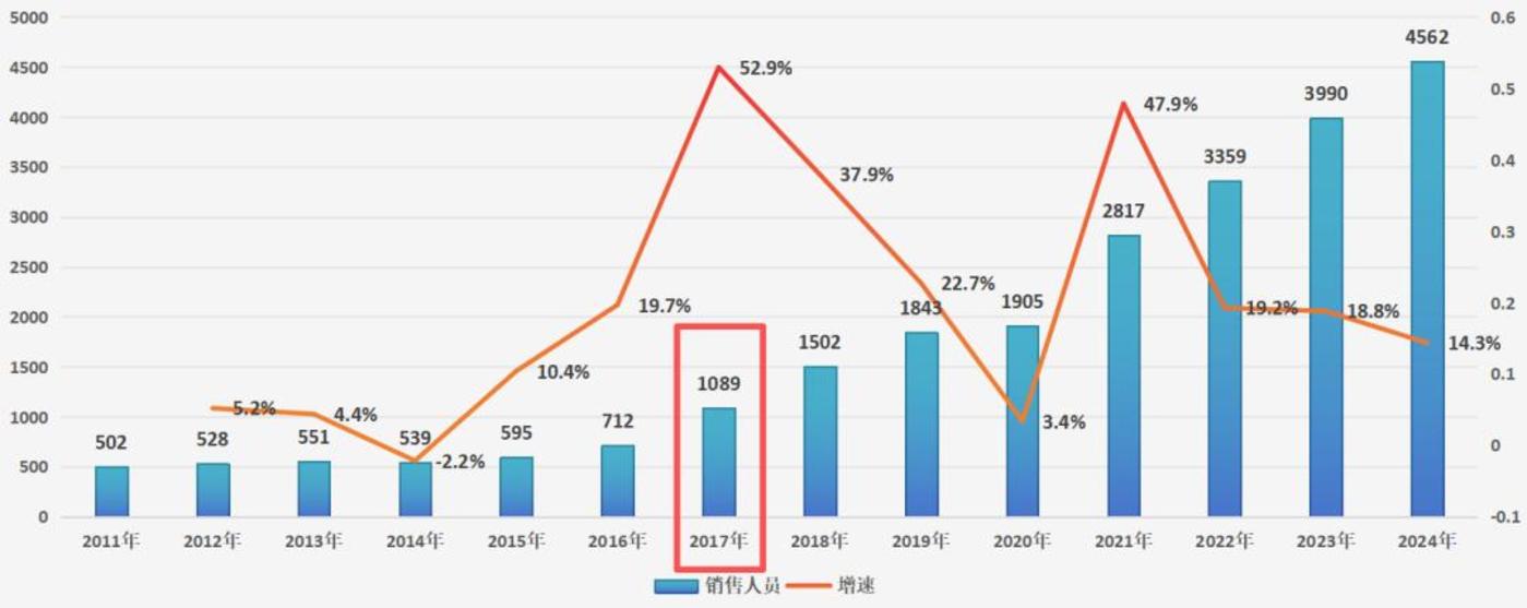 可以看到,从 2017 年开始,智飞生物销售人员数量迅猛增长,当年就暴增 52.9%。除 2020 年疫情因素外,智飞生物销售人员的增速始终不低。由 2016 年的 712 人,至 2024 年的 4562 人,8 年间净增 3850 人。默沙东 HPV 疫苗之所以曾经 「一针难求」,除 HPV 庞大的需求外,更与智飞生物迅猛扩张的销售团队密不可分,可以说默沙东与智飞生物之间属于互相成就。