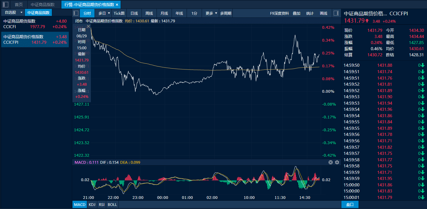 截至 29 日下午收盘,中证商品期货价格指数收报 1431.79 点,较前一交易日上涨 3.48 点,涨幅 0.24%;中证商品期货指数收报 1977.79 点,较前一交易日上涨 4.80 点,涨幅 0.24%。